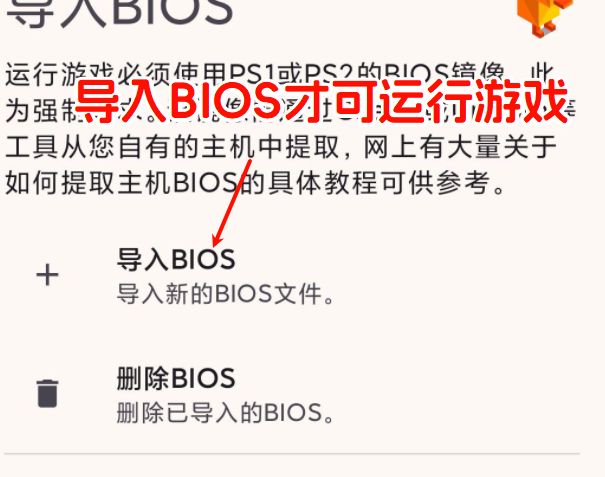 4、下一步设置导入bios,这里bios的文件可在下方获取,没有bios将不能运行游戏,下载后可自行在手机里新建一个文件夹,把bios文件拷贝进入。